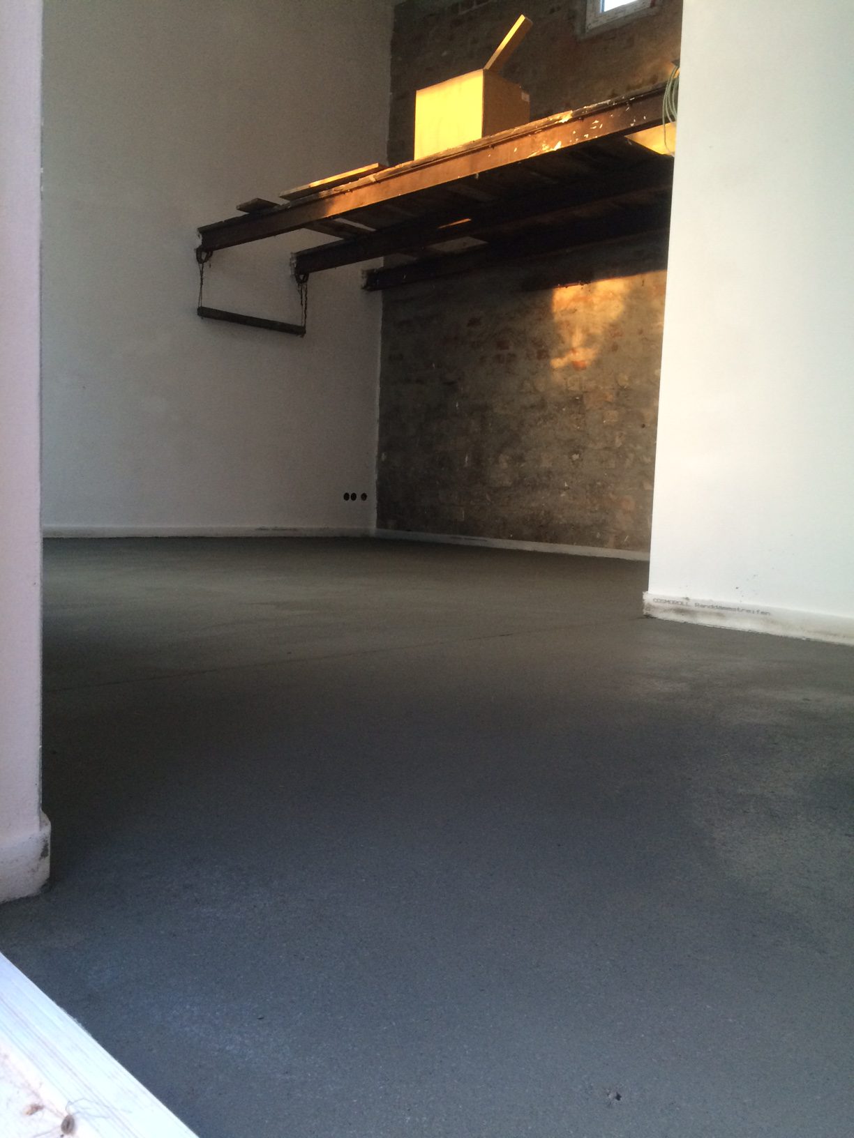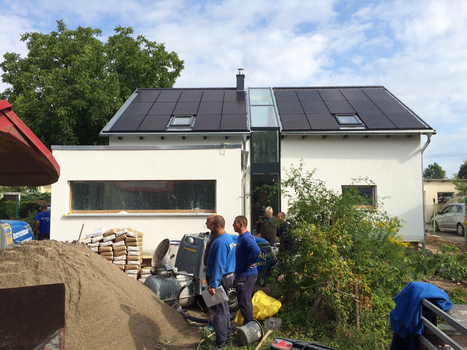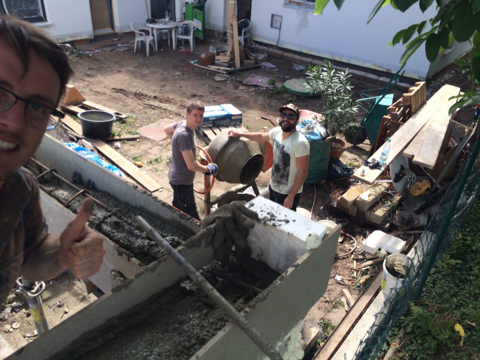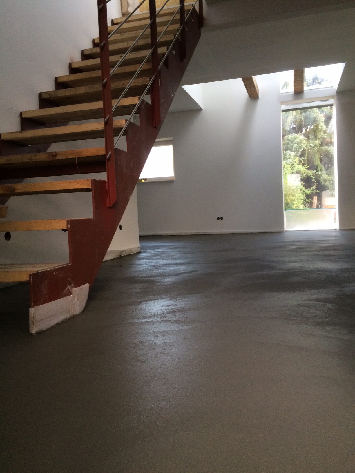 Subbotnik 2 mit Jan und Frank (Danke nochmal!) gerade zwei Tage her – 2,5t Estrichbeton für den Ringanker Teil2 gegossen – und schon kommen die, die es wirklich können: 8 Mann, 2 Estrichpumpen und 2 Muldenkipper Kies/Sand sind Montag früh vor Ort. Montag Nachmittag ist der Estrich fertig verlegt und das Haus wird zum Gondwanaland. 24h Warten, dann kann ich endlich rein und … *kaumerwartenkann* …
