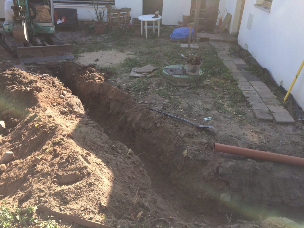 Angekommen am Zentralen alten Ablauf im Hof. Den baue ich als erstes um und Montiere einen neuen Punkt der dann später den tiefsten Punkt in der gesamten Fläche markiert. Laser-Level for the win! 😀
