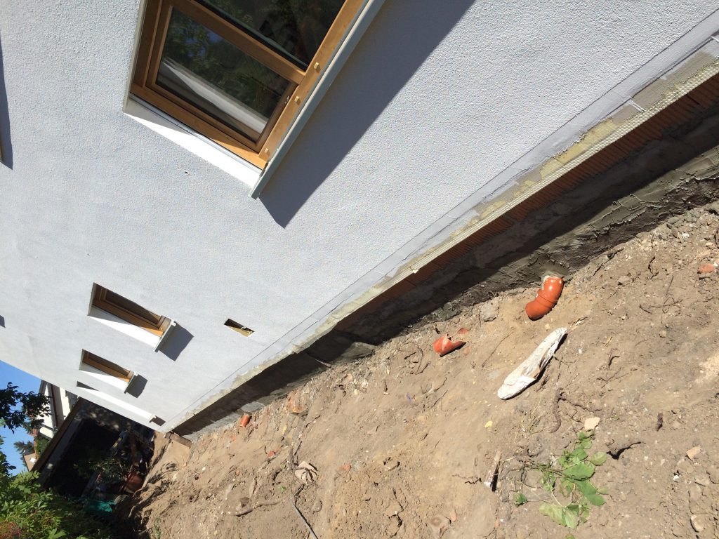 Und dann die finale Frage: ist die Horizontalsperre in takt oder nicht? Eine Probeschachtung mit Fachleuten vor Ort bestätigt das Vorhandensein und die angemessene Funktion. Cool, dann können wir die Gräben ums Haus ja endlich zumachen!