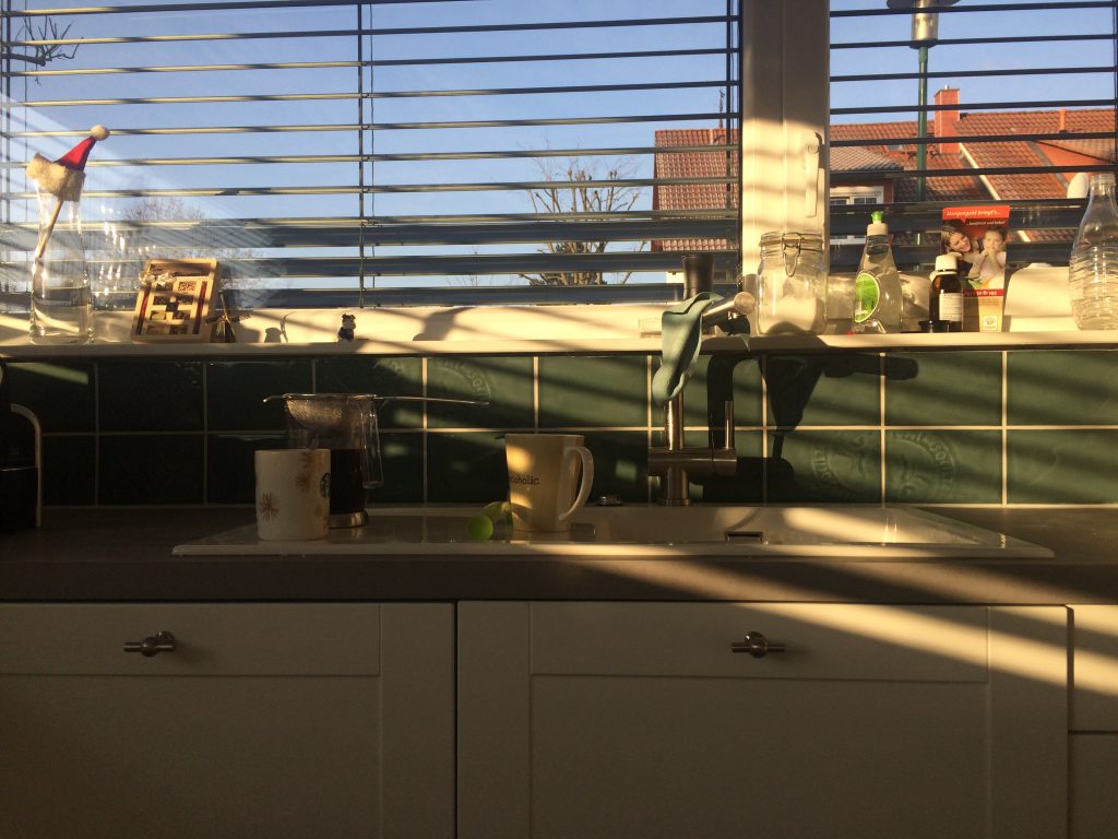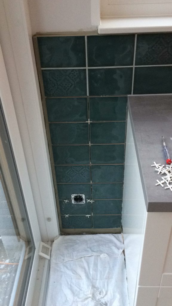 In der Küche habe ich den Spritzschutz gefliest. Die Auswahl der Fliesen war wegen des vorgegebenen Platzes nicht so einfach, aber die hier sind doch sehr hübsch und passent. Die Musterfliesen nehme ich dann für den Raumteiler/ Glasvitrine … selber Stil und damit eine runde Sache.