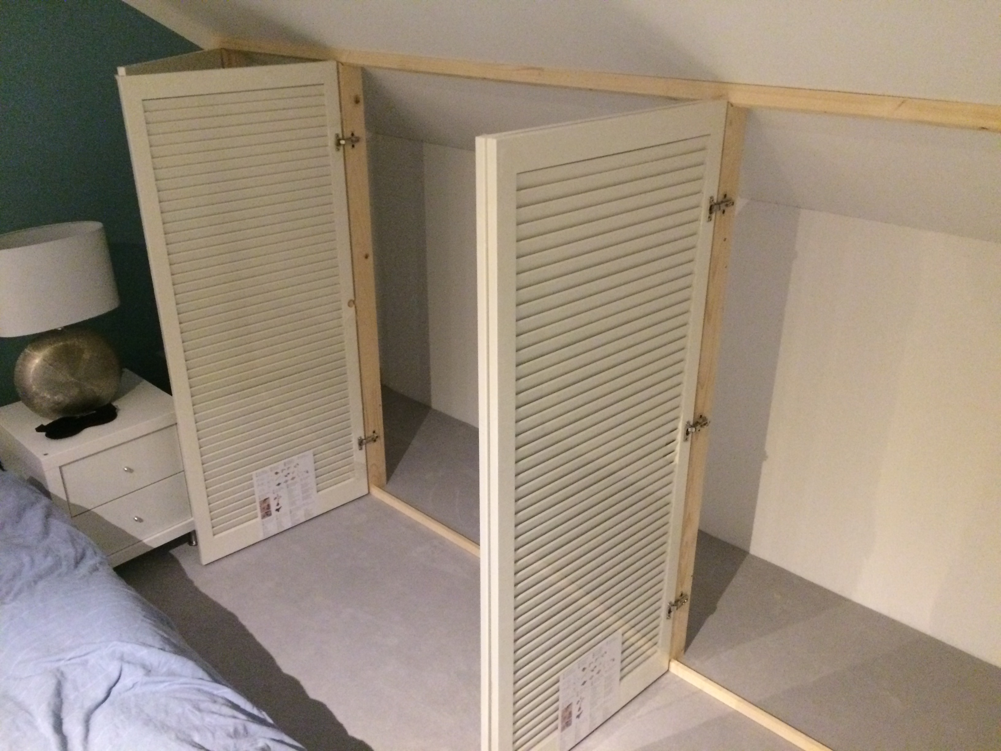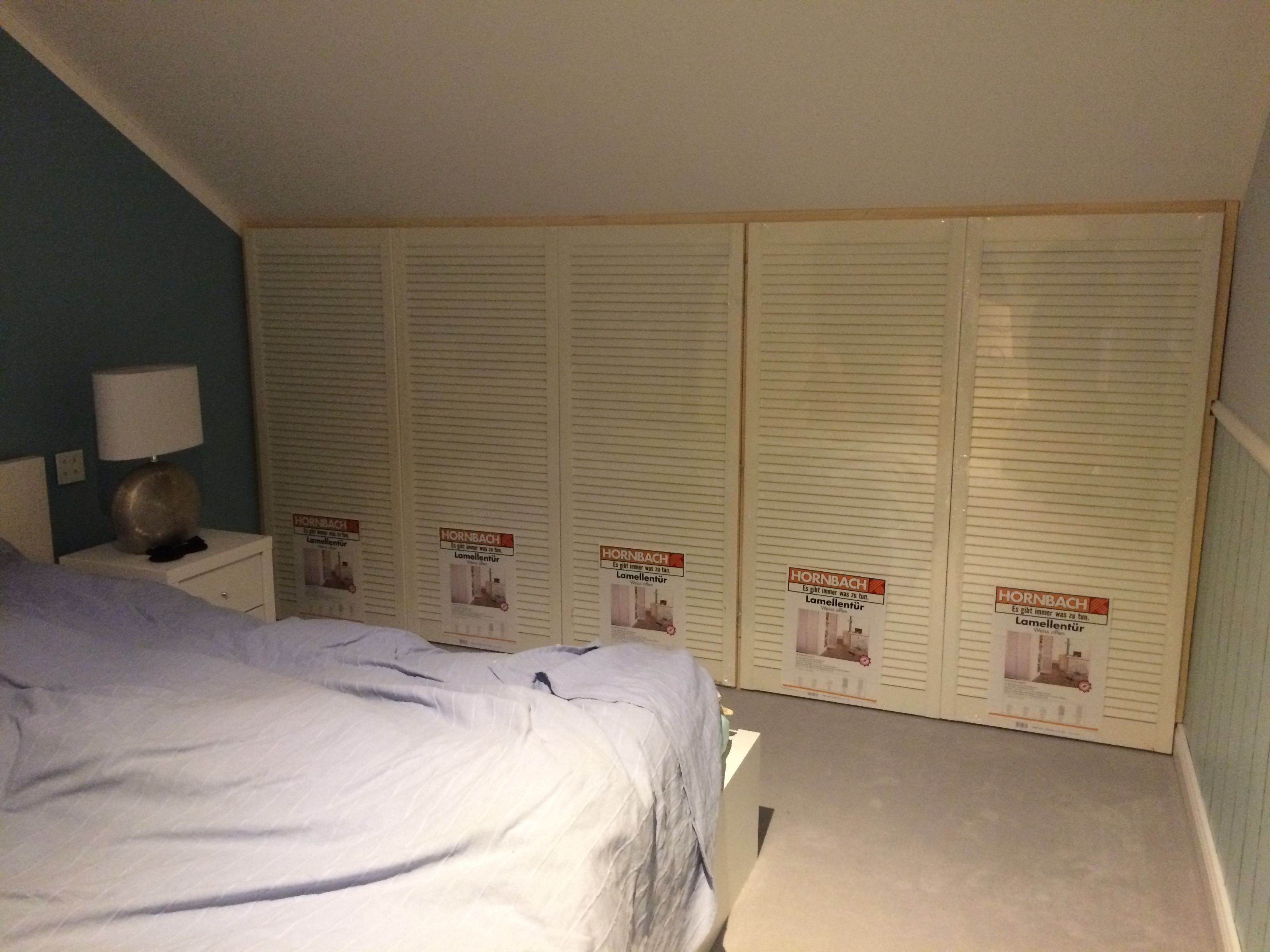 Dann gabs erstes Möbel im Schlafzimmer … In den Schrägen eingepasste offene Schranktüren. einfach und gut.