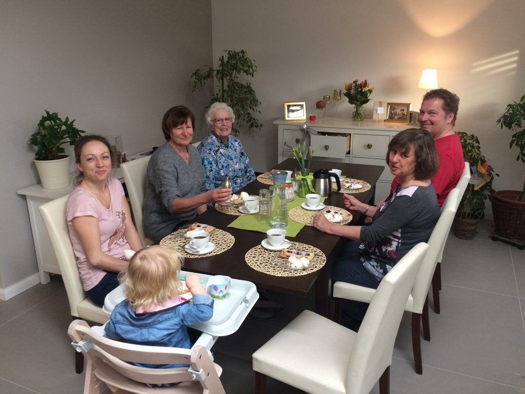 Hier zu sehen ist die Verkäuferin mit Ihrer Tochter und unsere lieben Nachbarn (rechts). Die Oma Goldstein hat nicht mehr ganz verstanden, dass wir das alte Haus umgebaut haben … für Sie ist es ein komplett anderes – aber ihre Tochter sagte viele schöne Sachen, wie „hier habe ich immer gesessen und meine Schuhe angezogen“ … das ist schön, weil wir das ganz genau so machen. Toller, liebevoller Nachmittag. Und toll auch, dass das Haus ein wenig Seele hat.