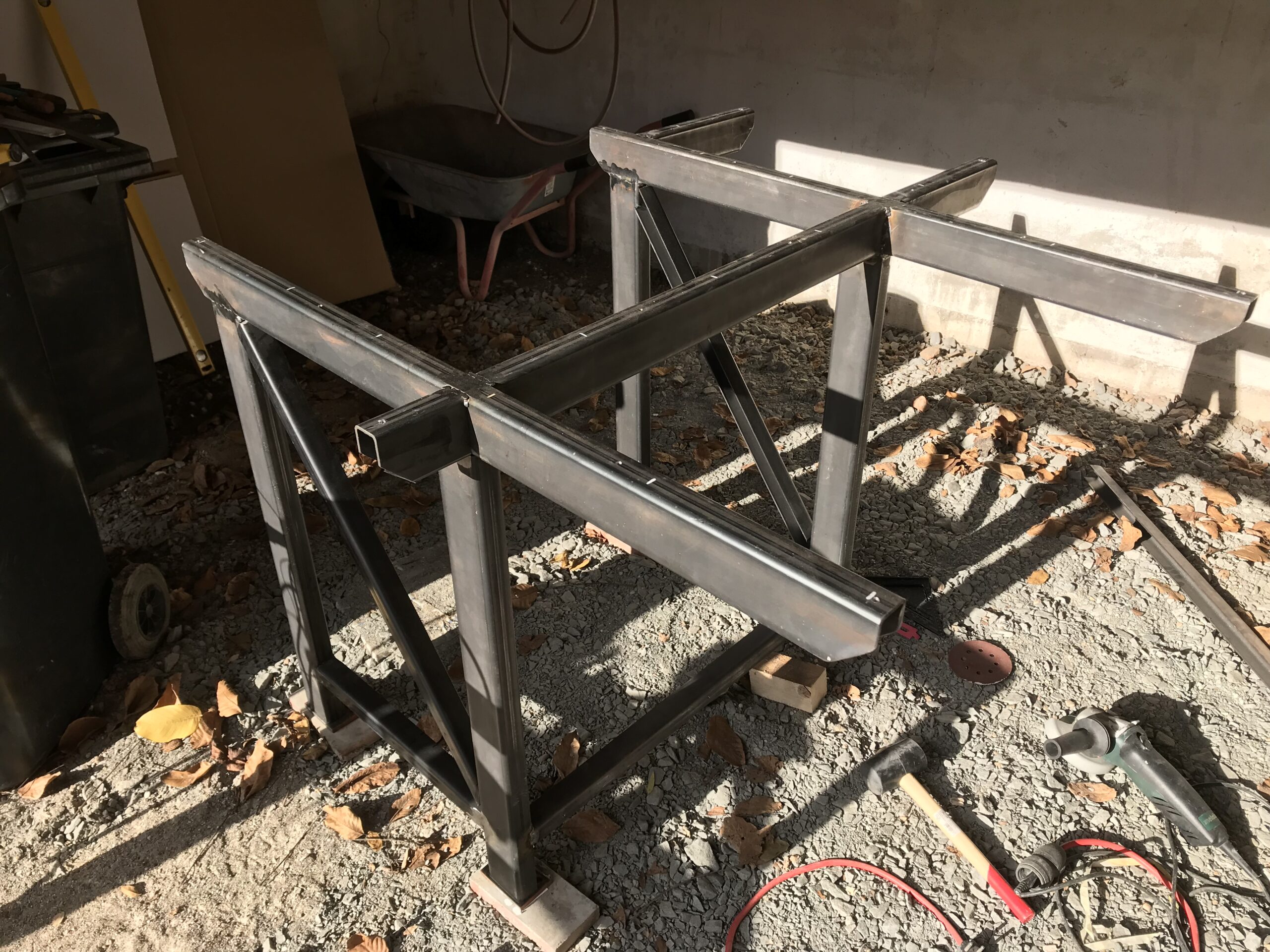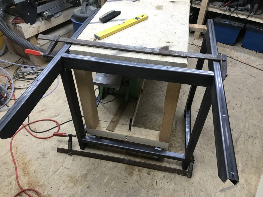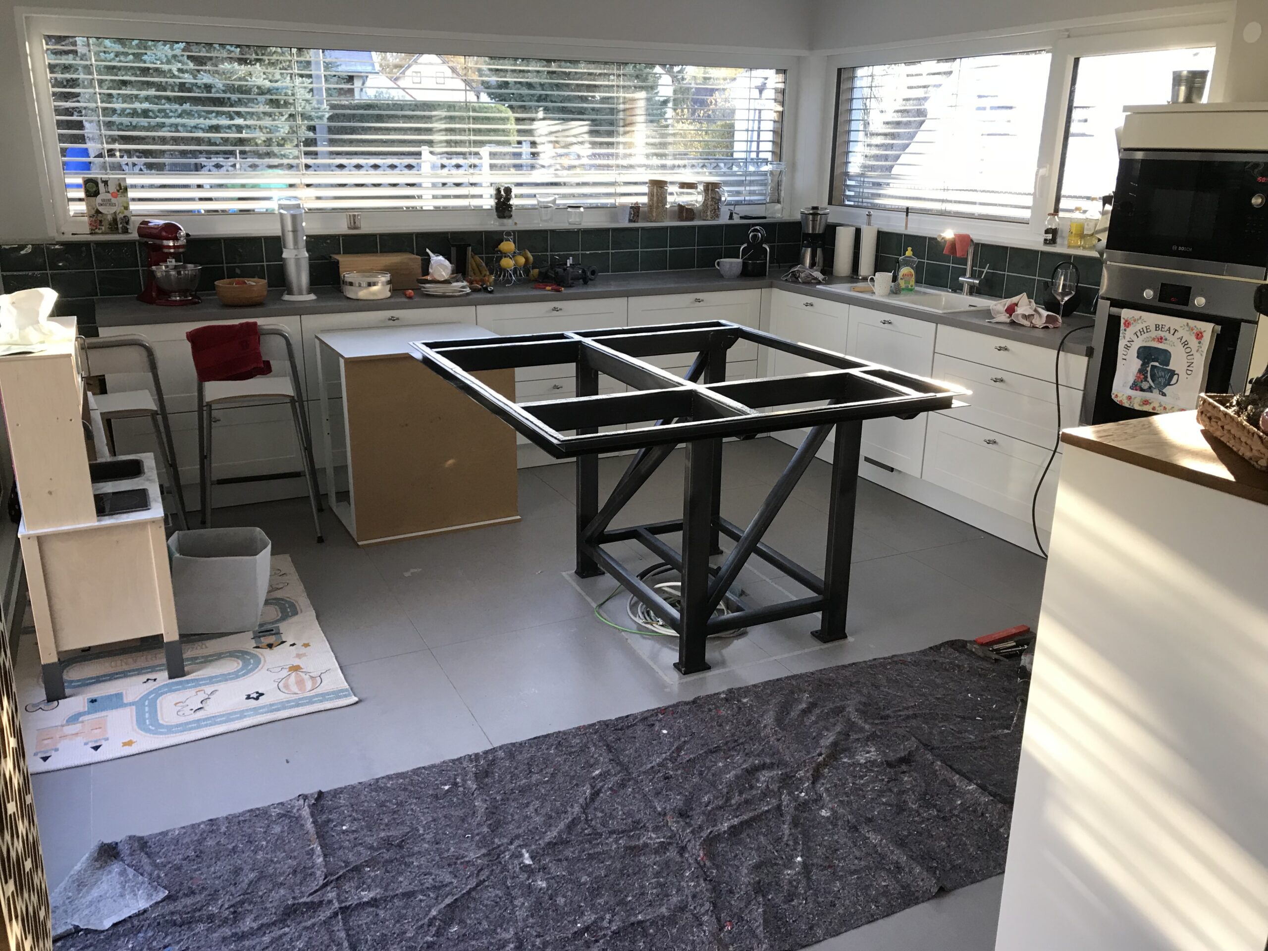 So, nach einigen wirklich faulen Tagen und der nötigen Ruhe hat mich Denny genötigt einzusehen, dass es Zeit wird nicht mehr am Provisorium zu Kochen (einem Unterschrank + OSB-Platte mit Kochfeld) und nun gings endlich an die Kochinsel. Ich hab noch nie geschweißt, und auch sonst keine Idee wie das geht. Nur … hats irgendwie hingehauen und sieht sehr sehr passen aus. Endlich essen wir in der Küche und müssen nicht alles ins Esszimmer schleppen. Das ist eine große Veränderung und wunderbar.