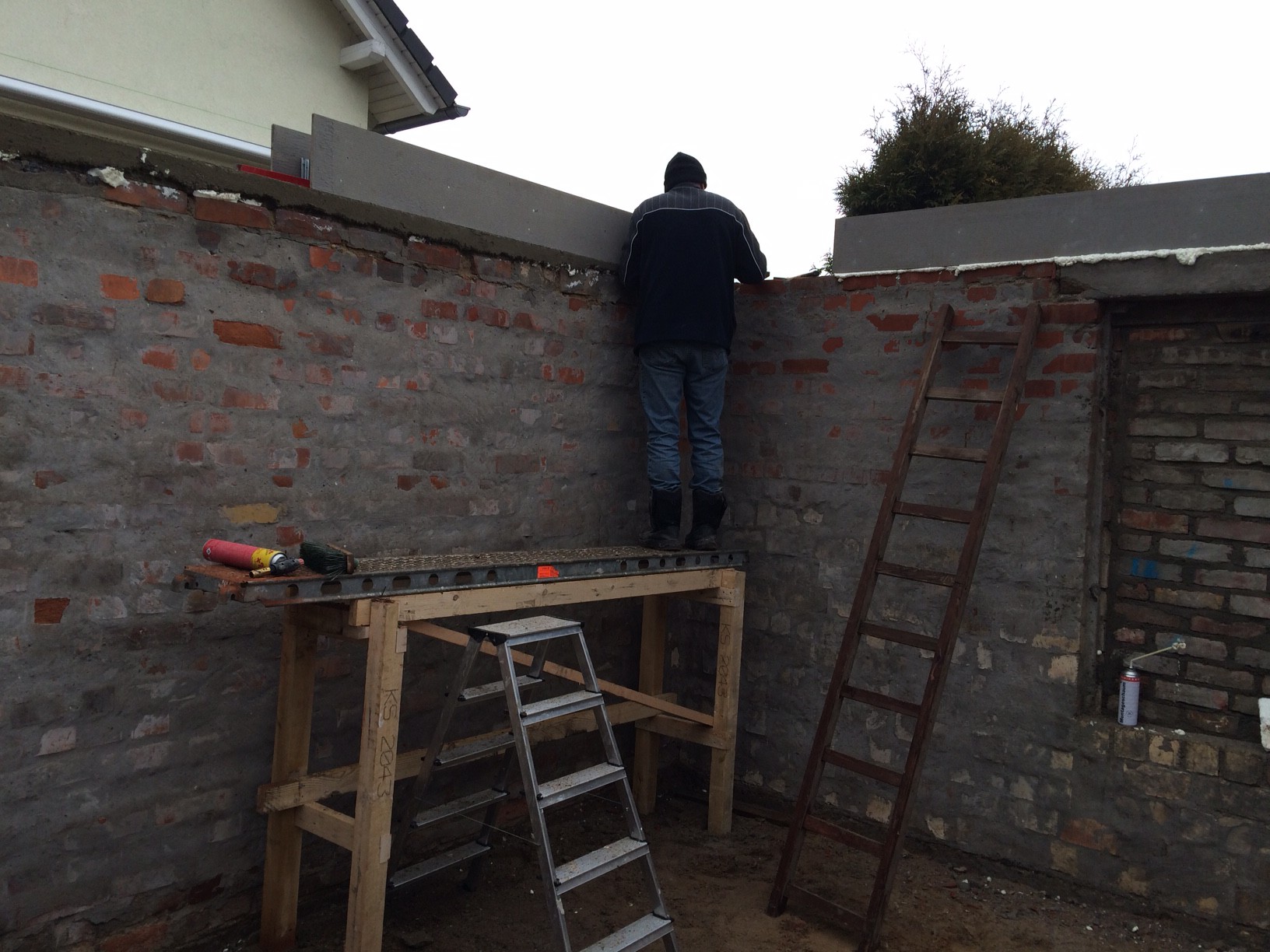 Innerhalb von nur drei Tagen bauen wir Schalung / Bewehrung, gießen Beton und füllen Eimer für Eimer in den neuen Ringanker auf der Werkstatt. Ja, im Handbetrieb, denn die 6,5 Tonnen Betonestrich – auf Palette im Freien und besonders praktisch super im Weg – müssen schnellstens weg, denn die Säcke haben bereits Feuchtigkeit gezogen und so langsam müssen die verarbeitet werden, egal wie. Also nicht lang schnacken, Kopp in Nacken! Zu Dritt klappt das trotz Regen am Sonntag sehr gut… jetzt wird es erstmal kalt und sobald es das Wetter zulässt geht es weiter.