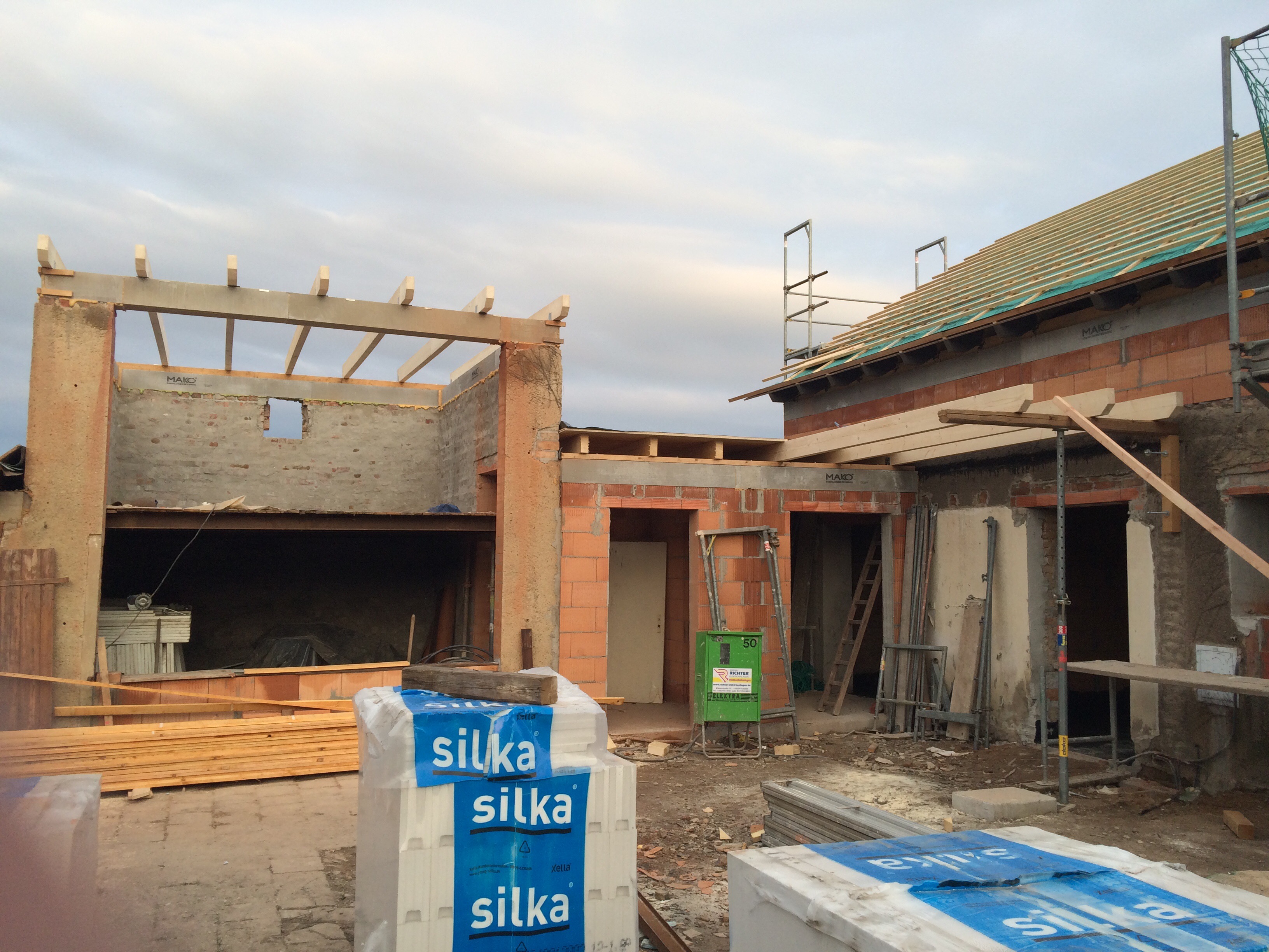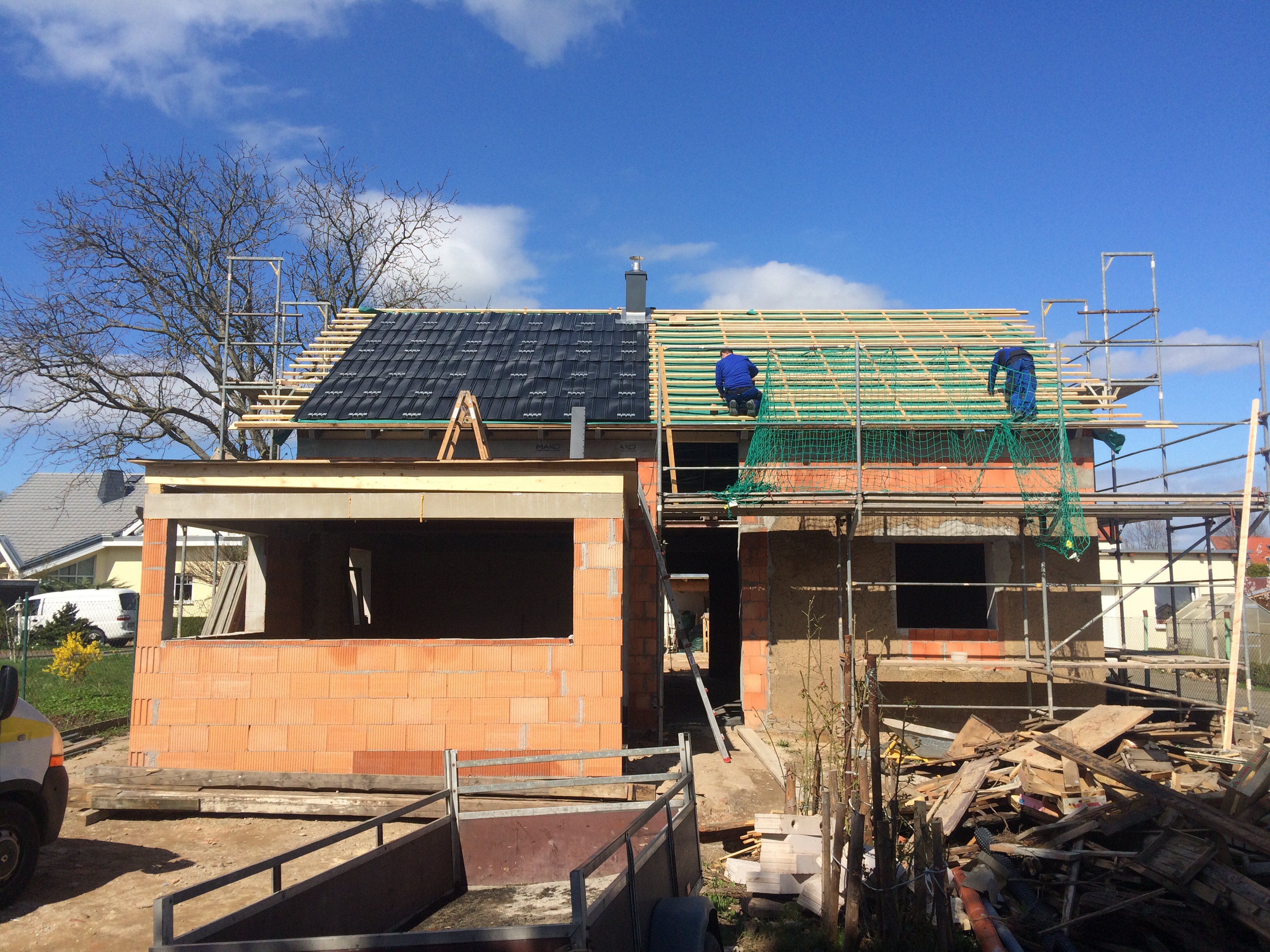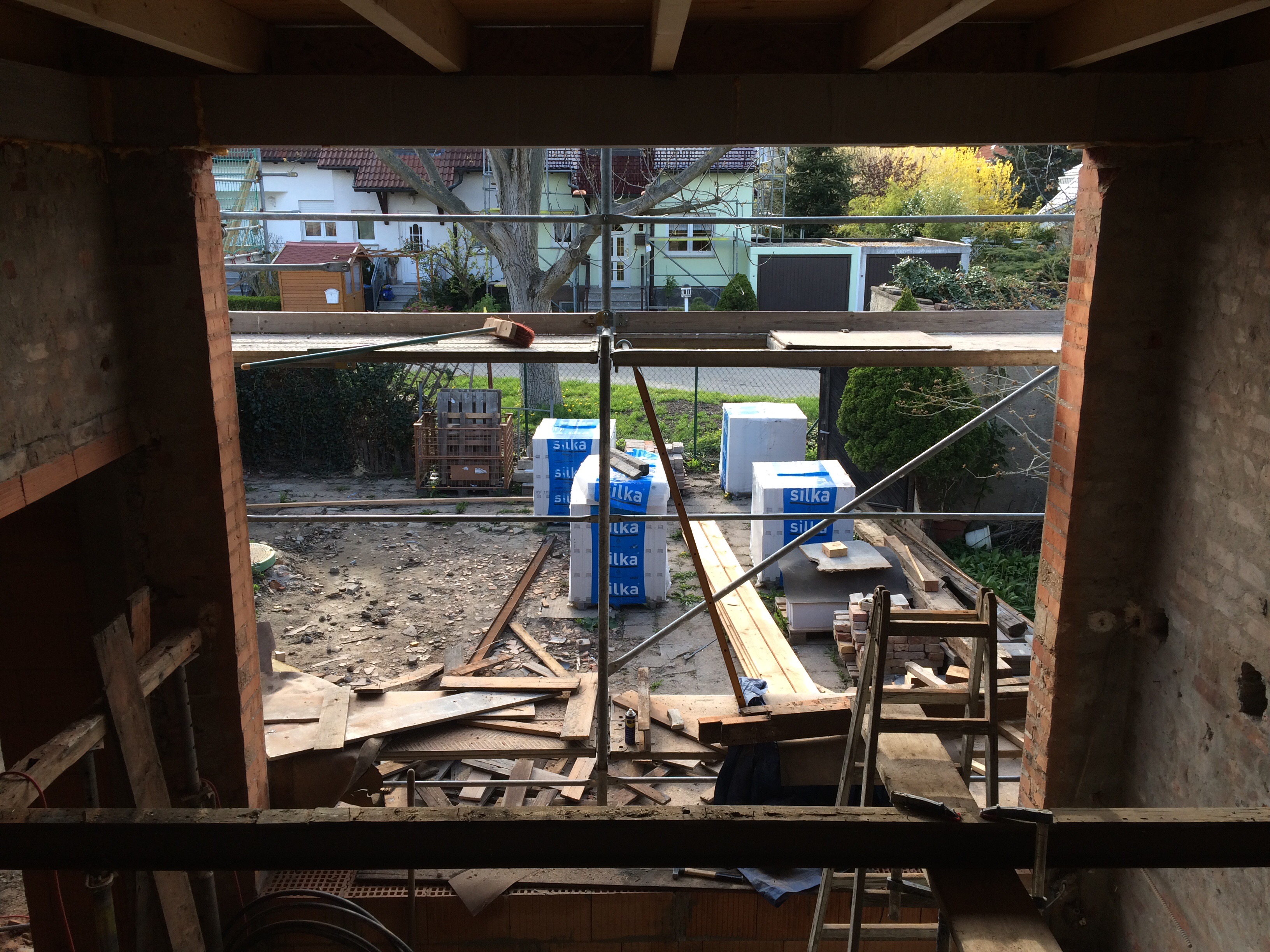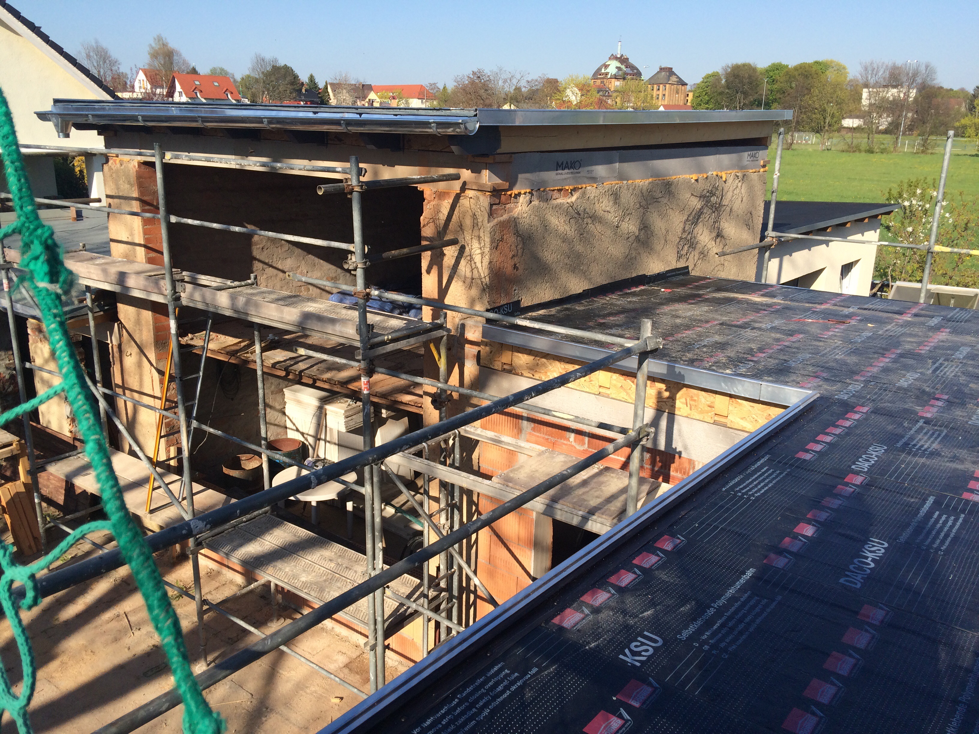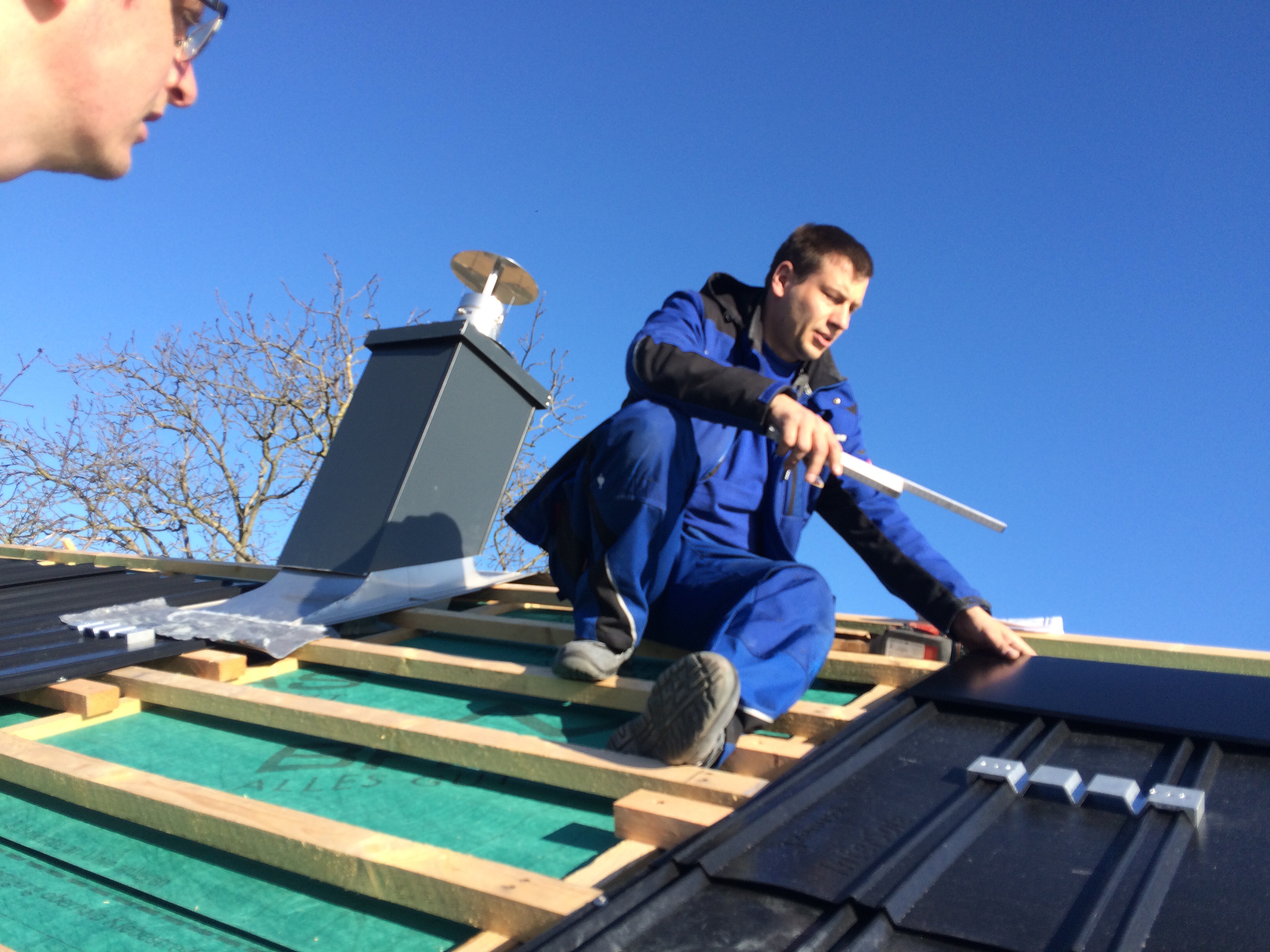 Ach… Davor gab es noch die Unterkonstruktion der Solaranlage. Das Abschweißen der Flachdächer und einen Arbeitseinsatz im Nebengebäude mit Papa. … die Jungs vom Kaminbau haben den Schornstein komplettiert. Sieht komisch aus, muss aber so. Ob es am Ende tatsächlich passt werden wir sehen wenn die Solaranlage montiert wird.
