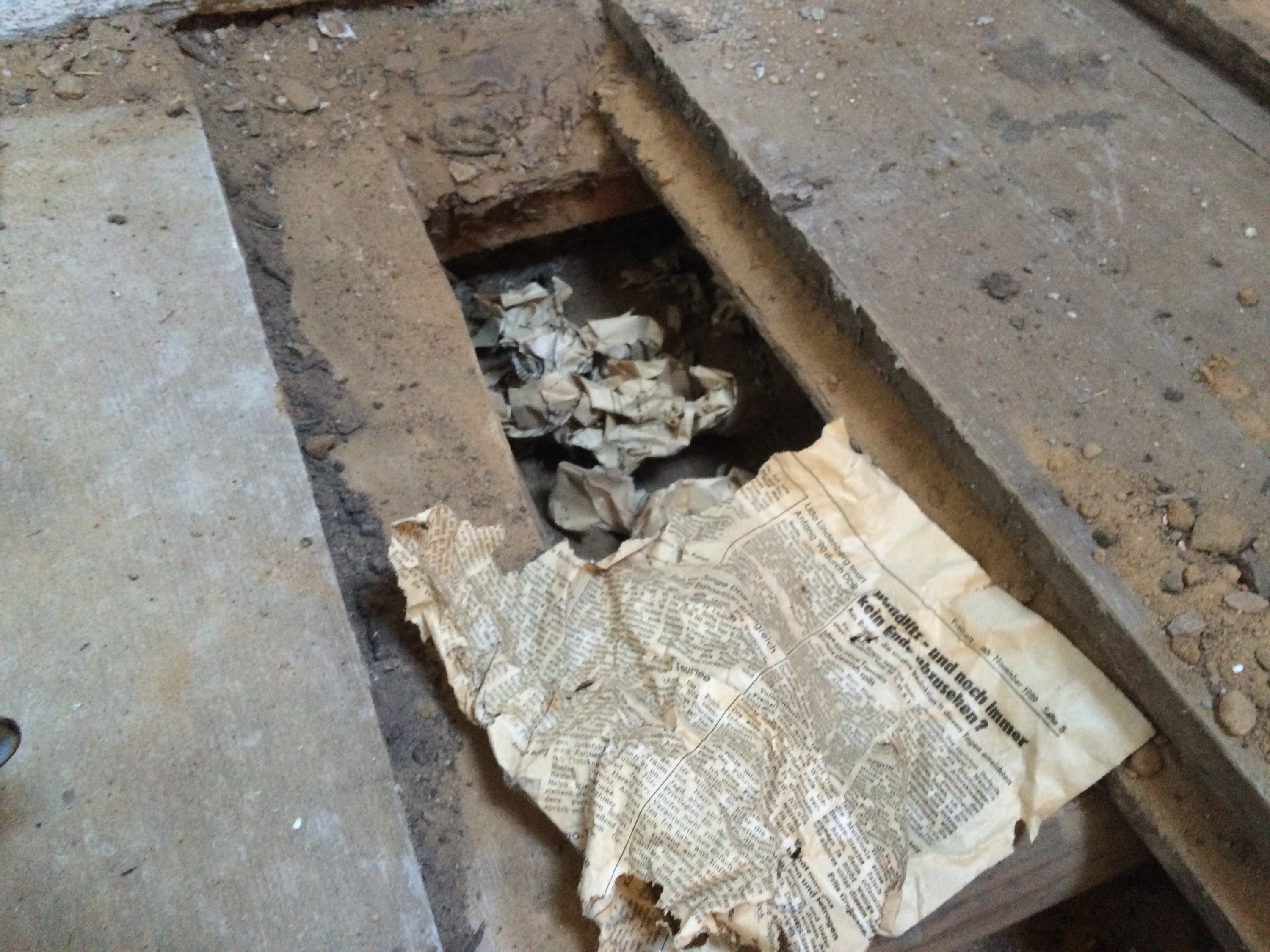 Da der Raum zwischen den Dielen im Obergeschoss offenbar genug Platz bot fand ich einen Zeitungsartikel vom 30. November 1989. Mal sehen was noch zu zu finden ist wenn wir die Dielen komplett entfernen.