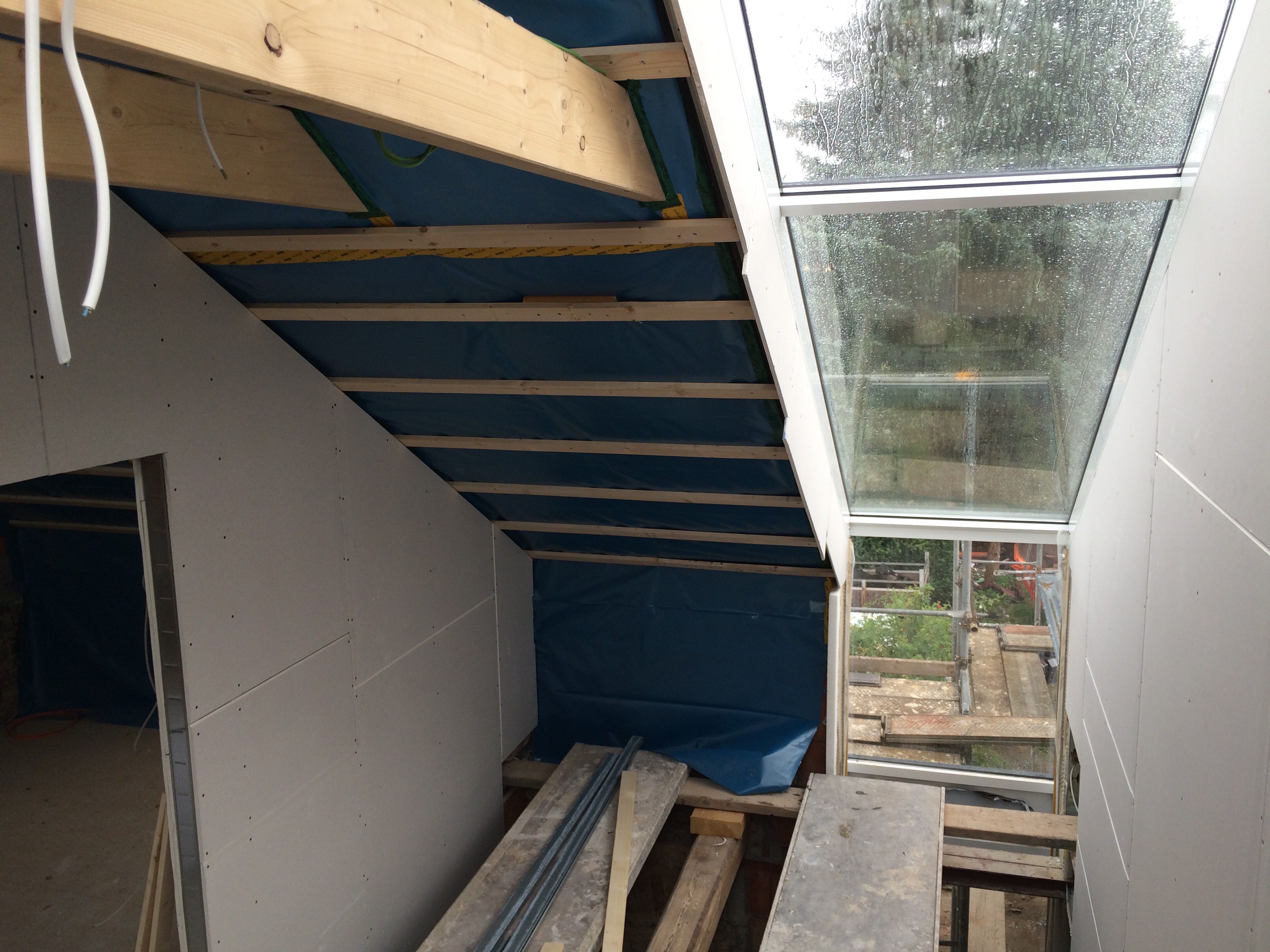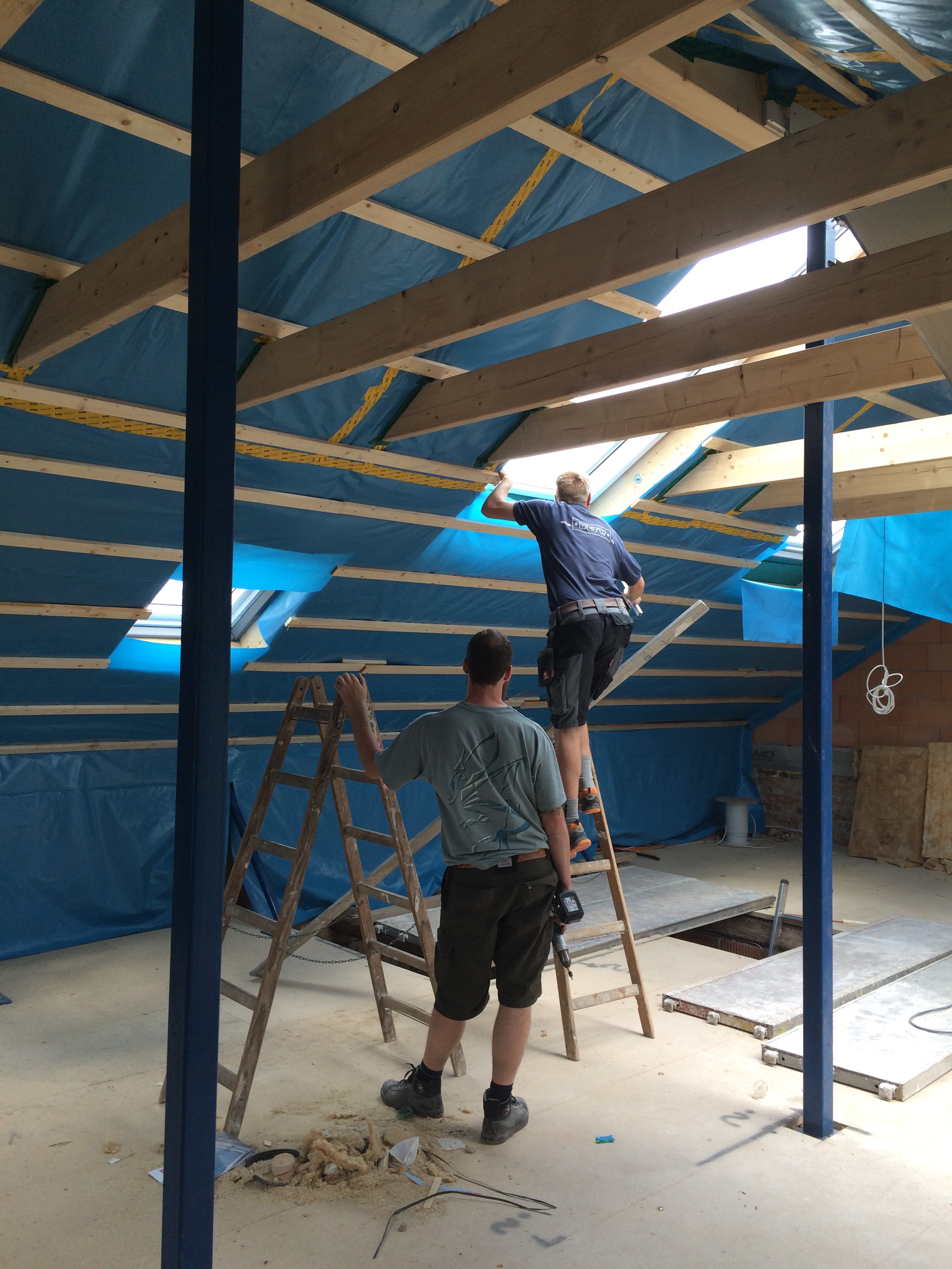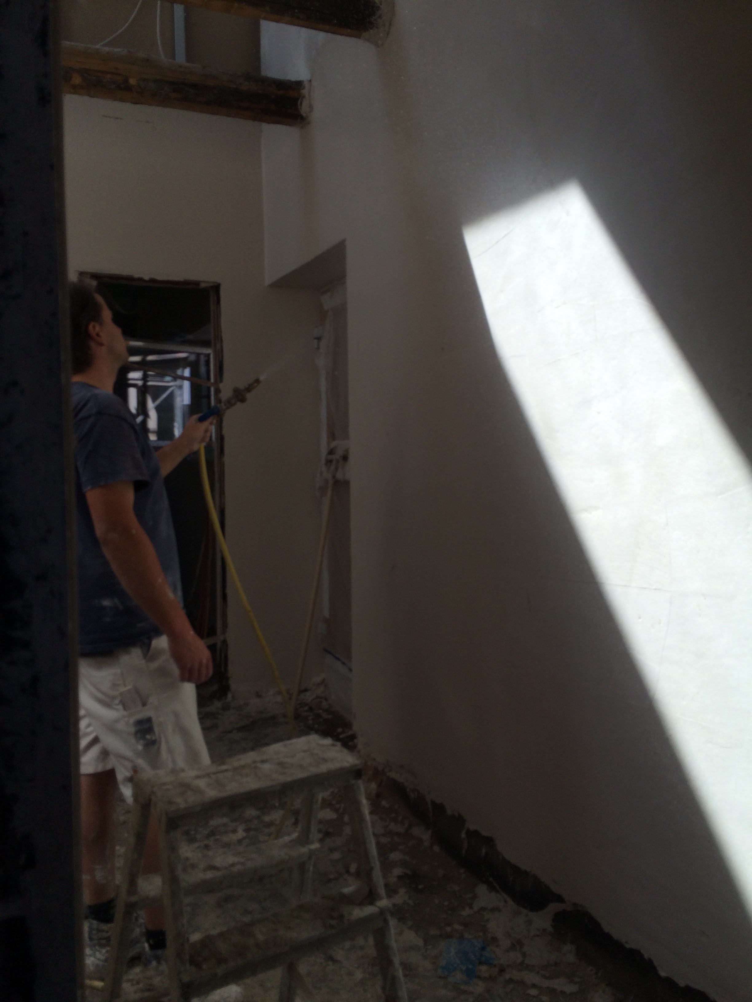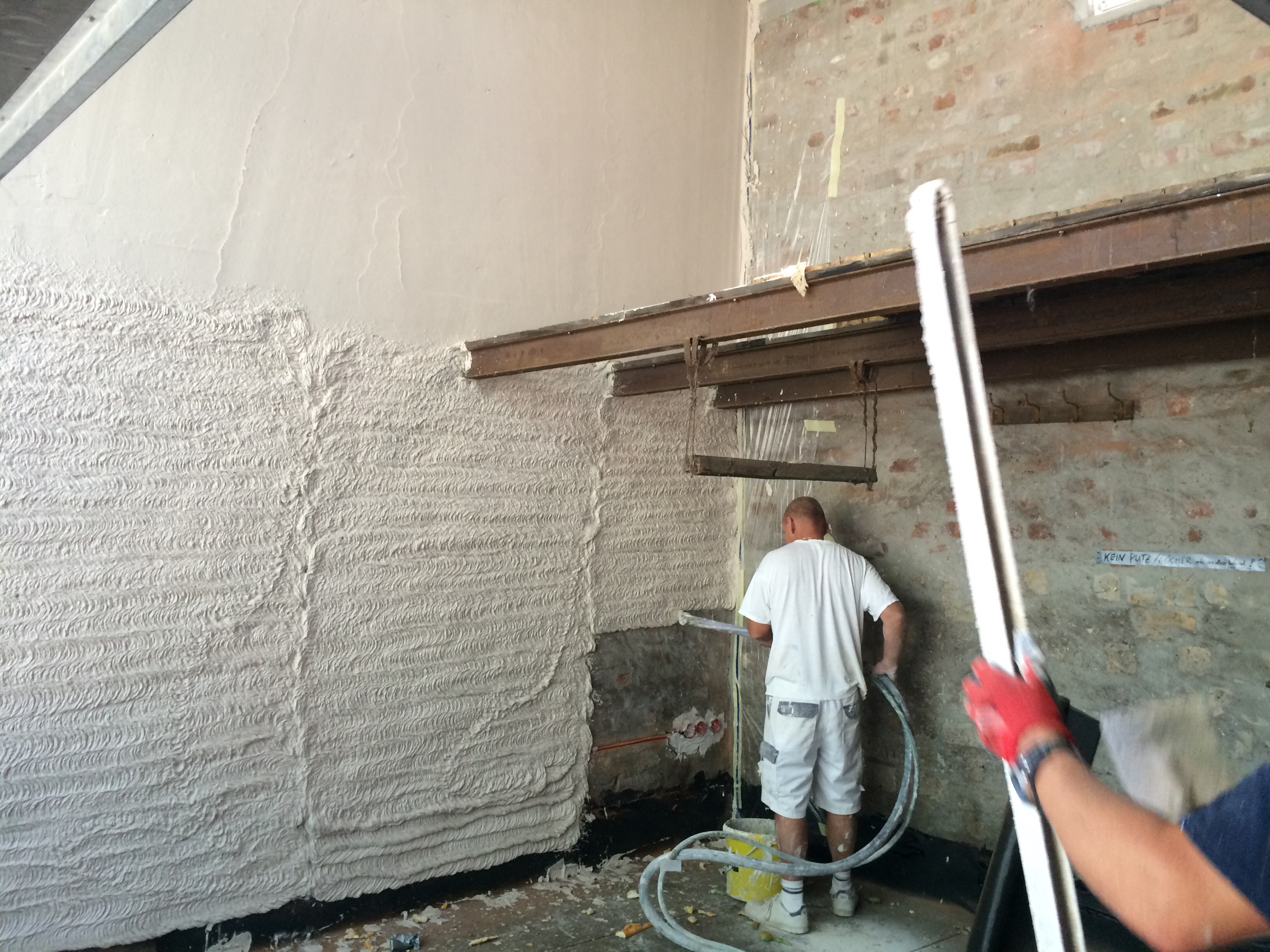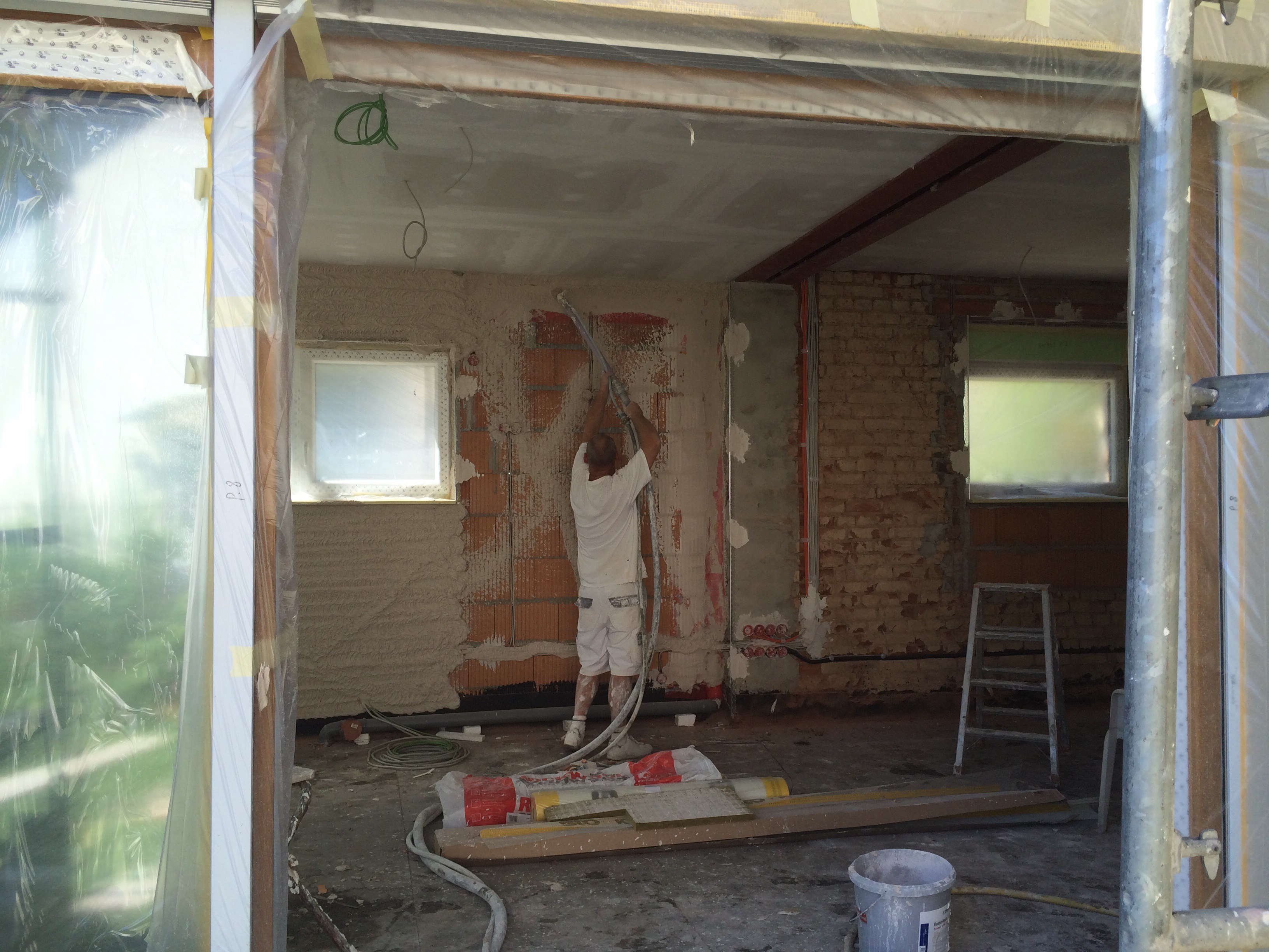 Ein echtes Highlight ist die Anbrinung des Innenputz….innerhalb von zwei Tagen verwandeln sich rohe Ziegelmauern und Gipskartonplatten in ebenmäßige weiße Wände. Zum ersten Mal bekommt man nun ein echtes Gefühl für die Lichtverhältnisse und Größe der Räume im Haus.