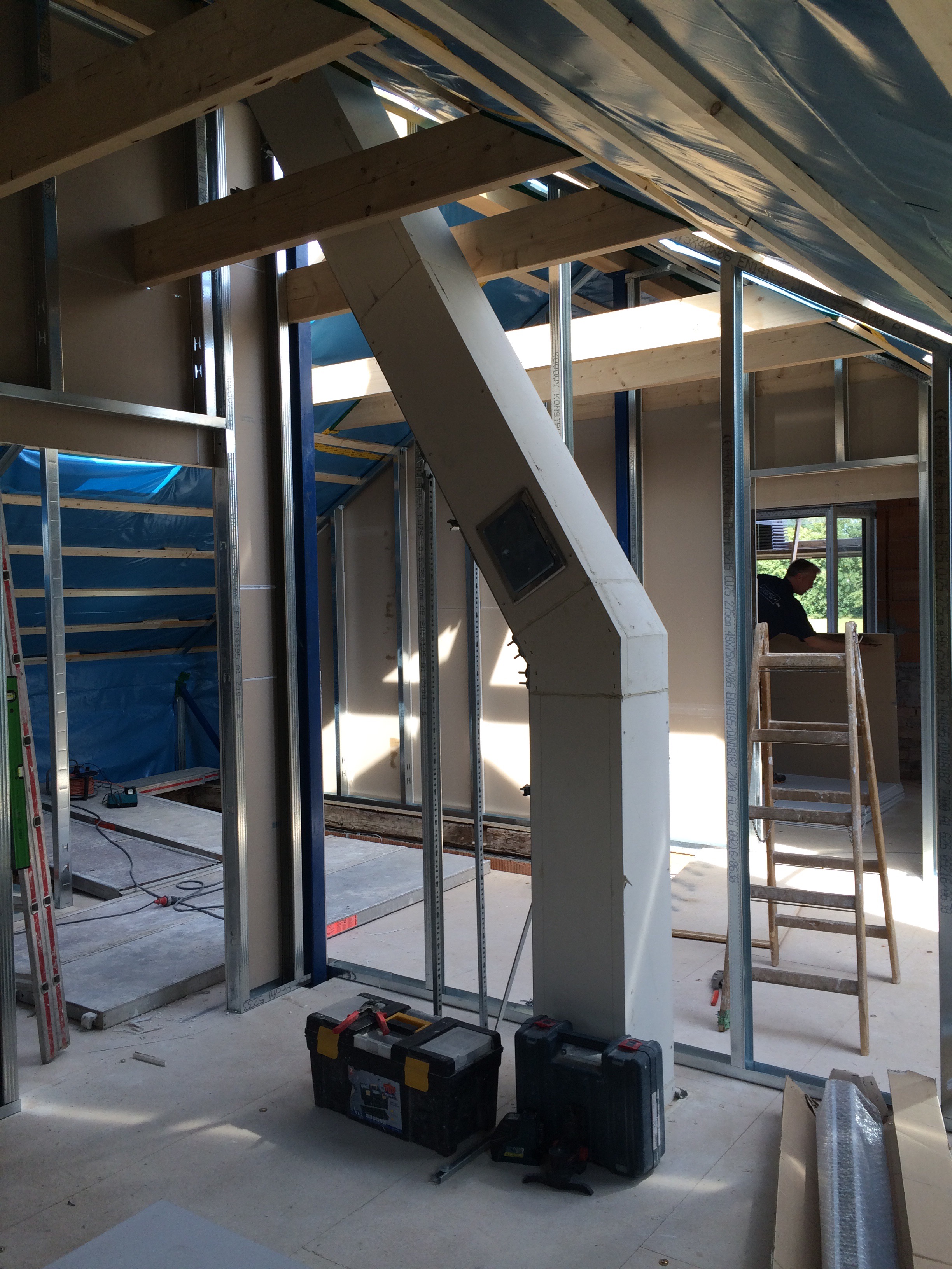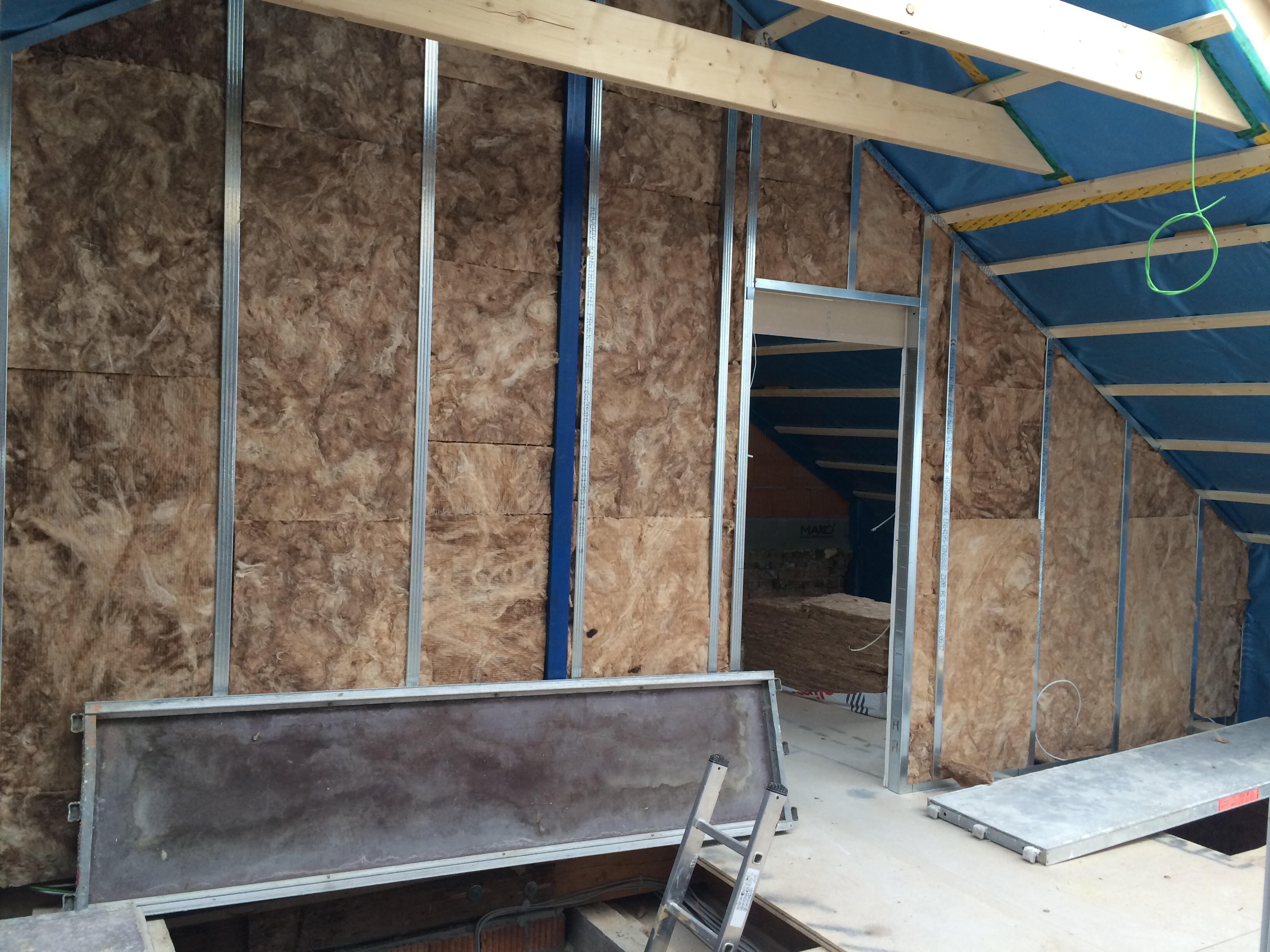 Der bisher große leere Raum im Obergeschoss füllt sich mit Gipskartonplatten und es entstehen tatsächlich die Räume die wir uns vor vielen Monaten überlegt haben. Kinder-, Gäste- und Schlafzimmer nehmen Gestalt an.