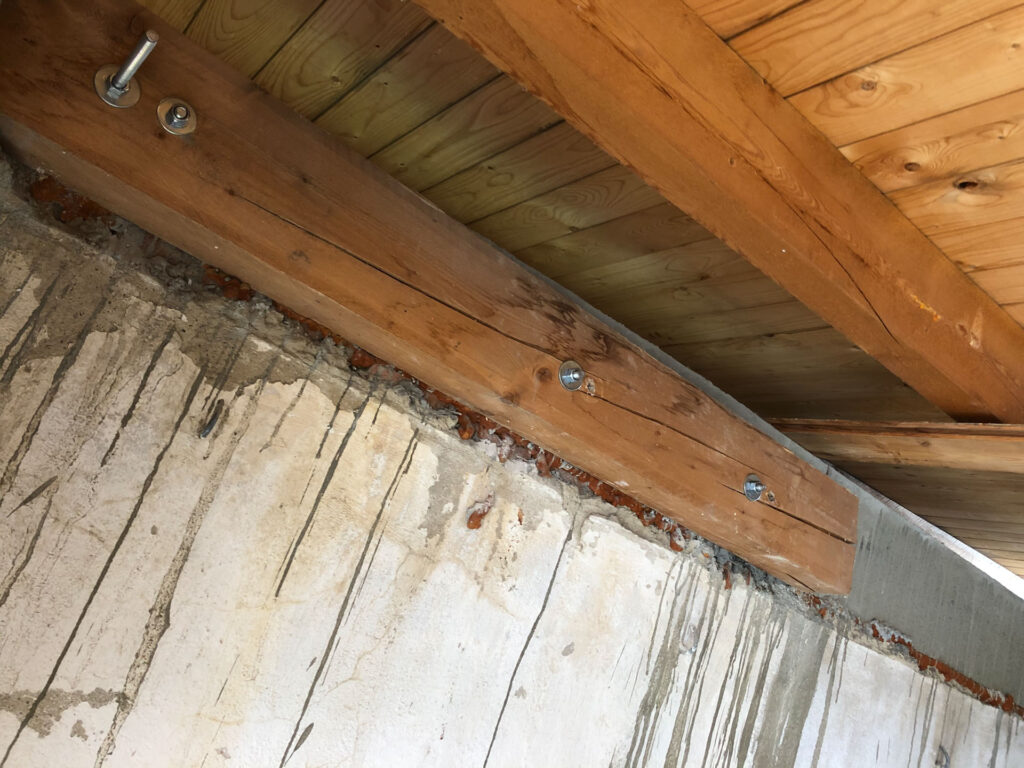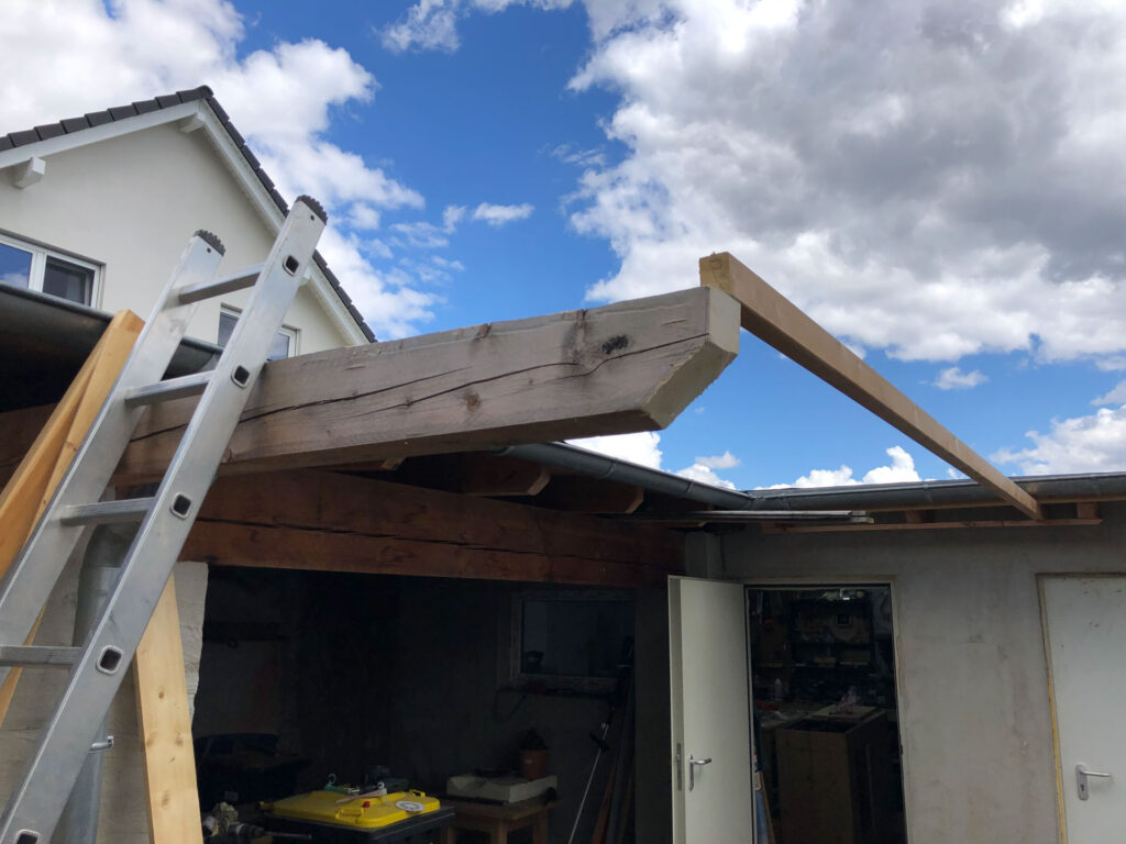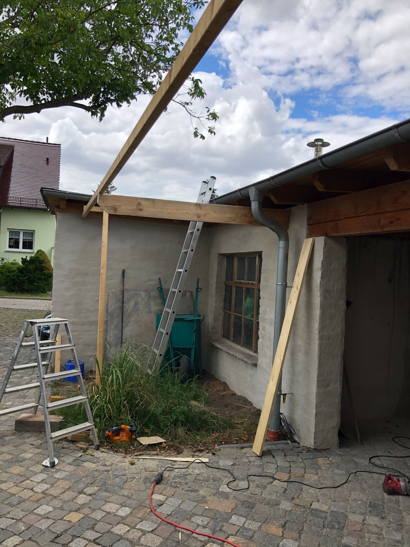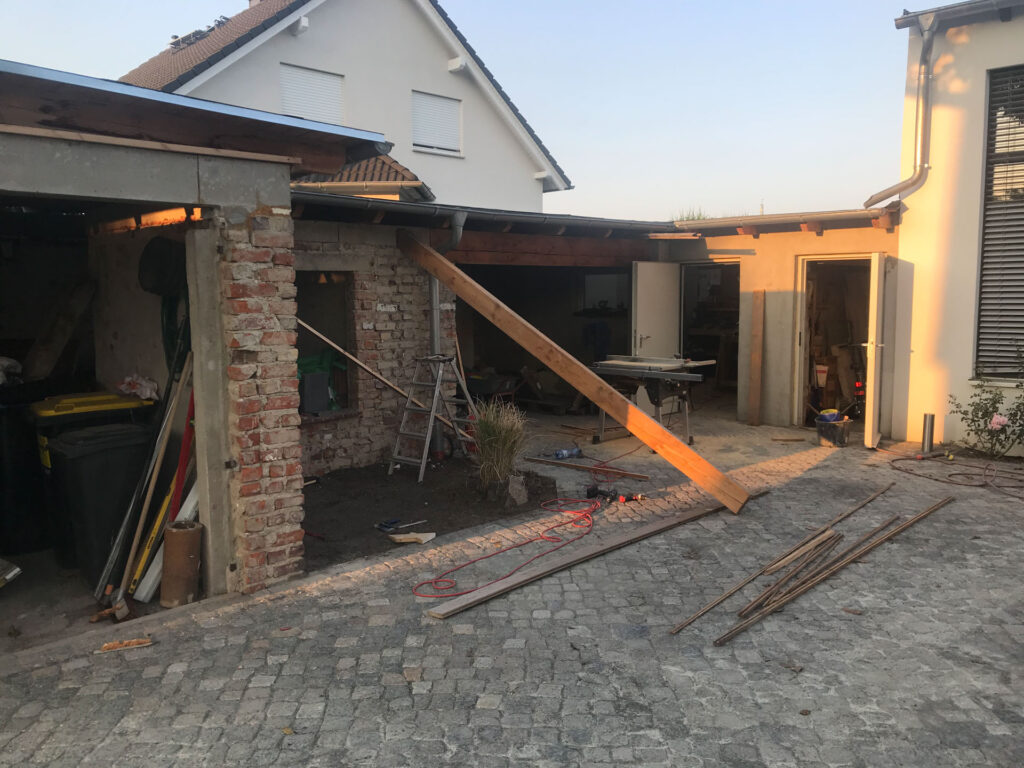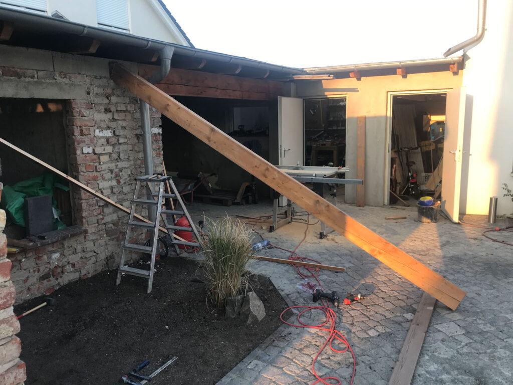 Ich hatte eine Stelle im Rinanker freigelassen, durch die ich gern einen Holzbalken schieben wollte, der dann die Querlatten der neuen Pergola halten sollte. Ob das klappt wusste ich nicht … aber es hat es.